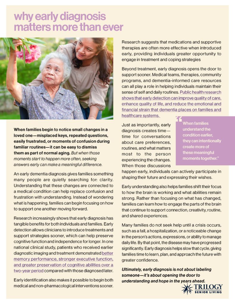 When you have a loved one living with dementia, all you want to hear is “mom had a good day today.” At Trilogy, the beauty of a “good day” lies in its simplicity—a parent laughing with their child, a former cook recalling their days on the line, or the spark in someone’s eye that tells you something familiar has found its way back.