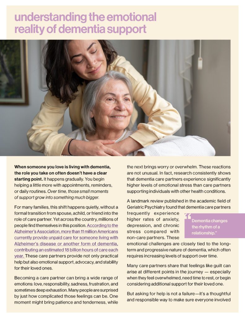 Dementia changes the rhythm of a relationship with your loved one. Asking for help is not a failure. Download for more…